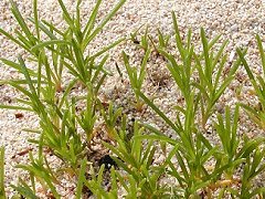 緑の小花を葉脇につ け開花は7〜10月咲 き 浜辺の日当たりの良 い砂地に生える ゆでて食用にする この写真は4月に撮 った 草丈40cmまで ここでは海にヒジキ 、砂浜には丘ヒジキ が生えていた 海のヒジキは生で食 べても塩味がして美 味しかった