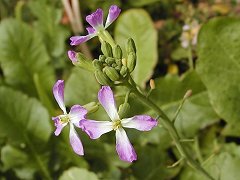 2〜6月咲き 浜辺の日当たりの良 い砂地に生える 葉は野生の大根 花は薄紫で花径2cm 程度 咲き始めは可愛くて 可憐だ 草丈1m以下