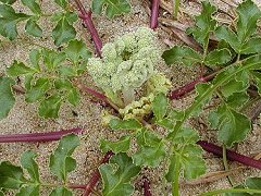 5〜7月咲き 浜辺の日当たりの良 い砂地に生える 赤い葉茎と緑の葉が 特徴 茎はほとんど見えな い 花は砂より生えたよ うに低くかたまって 咲いていた サシミのつまに利用 される せり科はよく食用に 利用される この植物の根が砂浜 に深く入りこみ、生 き残る強靭さを見せ ている