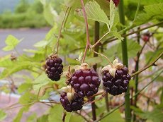 花は白色の5弁花 小葉は3〜5枚あり葉先は鋸葉で割 れる 黒い実がなる 実はわりに酸味が多い 強健でつるを伸ばし伸びた枝から 根をおろす 落葉つる性木 土質を選ばない 果托と集合果が分離しない 用途:ジャムや生食