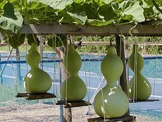 4月頃十分暖かくなって蒔く 棚を作って巻きつかす 夏になると夕方に白い5弁の花を 咲かせる 花径4〜5cm 実はぶら下がり、その風情が面白 い うどんこ病に注意 実が熟れると水につけて外皮を腐 らせて硬い殻を収穫し乾燥 種は取り出す この栽培は立派な台を作っている