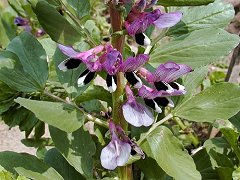 4〜5月に白と黒と赤紫の3色の花を 茎に咲かせる 花径20mm程度 温暖で深くて良い土地で栽培する 秋蒔き 寒地は春蒔き 酸性を嫌うので石灰を施す 連作を避ける 草丈1mまで 用途:若い実を茹でて食べる