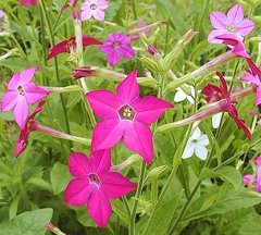 種蒔きは3〜4月 6〜9月に咲く 花径3cm 夕方に花が開き朝まで咲いている 日中は閉じる 花色は紅、白、桃、黄、中間色が あり、夕方が美しい 草丈80cmまで 日水はけの良い肥沃地に植える 高温多湿を嫌う 葉は幅広で大きくタバコの葉を思 わす 花の香りあり 利用方法:花壇や鉢植え用 花言葉: