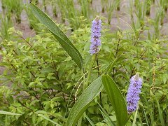 6〜11月に青い穂状の集団花を咲かせ る 花穂の長さ8cm程度 半耐寒性の水生植物 冬に葉が枯れる 日当たりの良い水辺で水深10cm位に 植える 花を入れて草丈1m以下 利用方法:水辺、切花用