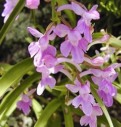 5〜8月にピンク色の花を咲かせる 花色は他に多色あり 花径20mm程度 岩地の崖に生える 花茎を伸ばして花をつける 花に長い曲がった距がある 半日陰で栽培する 水はけと通風を計る 草丈30cmまで 利用方法:鉢植え用