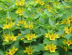 6〜7月開花 花色は黄色で中心が濃い5弁の花 水はけが良く湿気の多い日当たり地や 半日陰で栽培する 草丈60cm以下 名前はオカトラノオの属名から 増殖は株分けや種蒔き 強健 利用方法:花壇用 花言葉