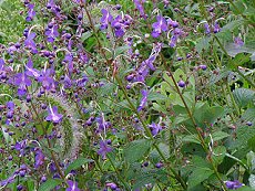 薄い水色と濃い青のツートンカラー オシベの形が面白い 8〜9月に咲く 園芸種で色も濃くなっている 薄い水色もある 葉は対生する 茎の先端に多数花をつける 花の長さ3cm程度 全草から異臭がする 日当たり地で栽培 草丈1mまで 野草のカリガネソウ