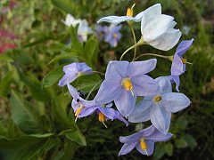 5〜11月に咲く 花色は白から薄青色 なすびに似た花が枝先に集団で咲き美 しい 花期が長い特徴がある 挿し木で増やす 普通の耐寒性 実は赤い 利用方法:花壇用 花言葉: