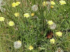 6〜9月咲き 乾燥気味の明るい道端に咲く 名前は良くないが群落を作ると結 構美しい 葉はタンポポに似ている(ロゼッ ト状) 花茎は細く立ち上がり長くて葉は 付かない 草丈70cmまで 花径は3cm位 英名は猫の耳だが豚の好みそう な草だ