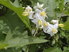 6〜10月咲き 茄子に似た小さい白い花を咲かせ る 草丈70cmまで 小さい黄色の実がなる 荒地や畠にいつのまにか侵入する 似た植物で犬ほうずきがあるが葉 が丸みを帯び黒い実をつける 有毒植物なので注意