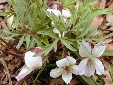 青色を帯びる薄いピンクの花 青い縦縞がある 花径20mm程度 4〜5月に咲く 少し高地の落葉樹下等、明るい場 所に生える 菫の仲間では葉に特徴があり、3 裂し細かく切れこむが夏には幅広 の3枚の葉に成長することが多い 似ている菫で葉が5裂する肥後菫 がある
