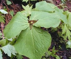 ふき状の茎に三枚しかない大きな 葉をつけて、やはり三枚のチョコ レート色の花を咲かせる 5〜6月咲 花径30mm程度 すこし高い山の木の下の陰で湿っ て肥えた場所に生える 草丈40cmまで