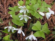 クローバー状の三枚の葉は紋章に あるくらい端整で美しい 2cm位の白い花は横向きに咲く 暗い林の中で、ほの白く見える 4、5月咲 林の樹下に生える 草丈10cmまで
