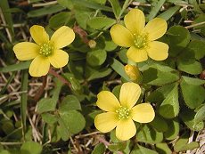 4〜7月に咲く 花径7mm大の小さな黄色の花 どこでも生えている雑草だが花は かわいい 葉を食べるとすっぱい 蓚酸(しゅうさん)を含んでいる 種に触れるとはじけて飛びだす 葉は3枚で形が良い しじみ蝶が食べる草 すっぱい葉を食べるから青くなる ? 草丈10cmまでで水平に拡がる