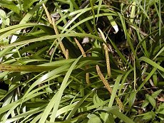 3〜5月に咲く 長さ7cm位の上向きに出る丸い紐 状の花 渓流に生える 水に強いが粘性の土地にも生き 残る 草の香りが良く、菖蒲湯に使う菖 蒲に近い 根茎を薬用に利用する 草丈30cmまでで冬も常緑で美しい 石際に植えると良い