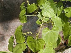 6〜7月つるの茎に絡まったよう な小花を咲かせる 葉はハート型で8cm大 雄雌異株 根茎が変わっていて山芋のようで あるが、大きいひげ根が沢山つい て老人のひげにたとえた 山芋のようには食べられない 地面を掘ると海老のように曲がっ た長いひげ付き地下茎が出てくる つる性植物 鬼は大型の葉や長大な地下茎が 連想させる