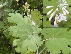 6〜8月長い茎を真っ直ぐに伸ば し、ベージュ色の円錐状集団花を 咲かせる 葉は大きく互生し20cm大になる 茎は白く、少し青みを帯びている 竹のようにすくすく伸びる 日当たりの良い山の乾燥した荒地 に生える 毒草で注意 茎を傷つけると黄赤色のアルカロ イドを含む有毒の液を出す 草丈2mまでで長大