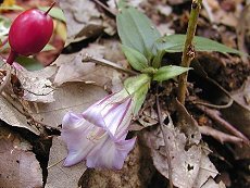 8〜11月に林の中の地表に咲く 薄紫の筒状の花 高地から低山まで分布巾が広い 草や木に絡まる 花径2cm程度 秋から冬にかけて赤い実が出来る 見つけ易い花だ