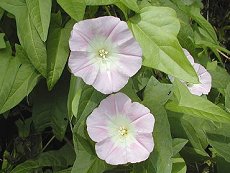 5〜8月に薄ピンクの花を咲かせる 花径5cm程度 葉は矢じり型で先端は細く両側の 側片は2裂する夏に咲くひるがおは葉の側片が2 裂しない 路傍に群れて咲いているのも美し い 通常は実が出来ない 野原や林縁、道端など日当たりの 良い荒地に咲く つるを引抜いても白い根が地中に 残りまた繁殖する