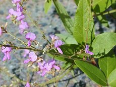 8〜9月開花 花は1cm大でピンク色が濃い 花に赤い目がある マメ科らしい花だ 道路ぞいの日当たりの良い場所に 生える 日本原産の盗人萩より花が一回り 大きく美しい 葉は盗人萩の三角葉でなく細長い 草丈1mまで