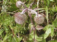 9〜10月開花 花径5cm位で山火口より一回り大 きい 少し高地の乾燥した草原に生える 長い茎の上にとげの多いアザミ型 の花が下向きに咲く 葉場山(はばやま)はすすきなどの 草刈場 火口(ほくち)は火打石の火を移し とるもの 草丈2Mまで つぼみがアーティチョークに似てい る