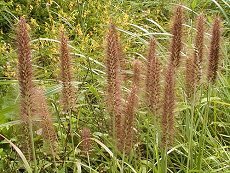 9〜10月咲 日当たりの良い硬い草地に生える 株から多数花穂を出して、長い花 穂は15cm位 ねこじゃらしを抜くつもりで引っ張 るととんでもない 茎も強く根も堅固で動きもしない 手が痛くなる 力芝とは良く名づけたものだ 穂はやさしくて撫でてみたくなる 草丈80cm位 奥に黄色の花はつるけまん