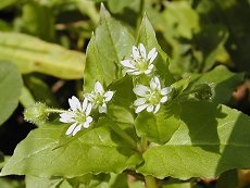 4〜10月咲 湿った日当たりの良い土地に生え る 花は5mm位の白い小花 はこべに比較し葉が一回り大きい 葉は波打つ 雌しべの柱頭が5っに分かれる はこべは3っ 茎もはこべに比較し太くしっかり している 草丈50cm程度で横に拡がる