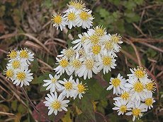 9〜11月咲き 花径2cm大 茎を長く伸ばし白い花を枝先いっ ぱいに咲かす 山地の道端や林の縁などに生える 田舎菊に似るが葉は茎を抱かない 草丈1mまで 嫁菜の白色版