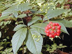 5〜8月に開花 小さい線香花火のような花 落葉樹林(ぶな林など)に生える 丸い実は赤く熟し朝鮮人参に似る 葉は5枚で栃の木の葉に似ている 草姿も朝鮮人参に似ている 草丈50cmまで 残念ながら、昔は和人参と呼ばれ たが薬用効果に乏しい 薬効が無いので森で取らないこと