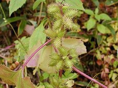 8〜10月に咲く トゲのある実は長さ2〜3cm まるで虫のようだ 先端などに雄花がつくが黒くなっ て落ちる 荒地や道端に生える 実は毛皮などによく付く 寒くなる頃この実をセーターなど の服に投げつけて遊んでいた 草丈1mまで 名前にオの字が3ケもあり言いに くい オナモミは日本にも生えており実 は小型