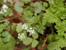 3〜5月に咲く 小さい白い花で5弁 半日陰山地の道沿いや林内に生え る 葉はヨモギの若葉に似て切れ込み がある 2回3出複葉 草丈30cmまで