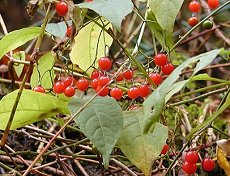 8〜9月咲 林の縁や山地の道端に生える 花径は1cm大程度 ナスの花を小さくした形で花弁が 反り返る 実は液果で赤く熟す(ミニトマト をミニにしたよう)径8mm 枝から出る葉と対生して花茎を出 す 有毒植物 葉先が3っに割れる 茎や葉に毛がある つる性 やまほろしに近いひよどりが実を 食べる