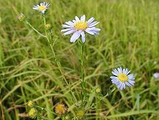 9〜10月に日当たりの良い乾燥気 味の山地や草地に咲く 薄紫の花色も美しい 葉は細長く毛がありざらつく 茎は立ち上がり普通は細く高い 花が咲く時期に下葉が枯れる事が 多い 草丈1m以下 海岸に近い山地に多い 海岸の砂地に咲く変種のはまべの ぎくを見る