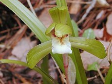 3〜4月に咲く薄緑の花 地中より花茎を出し下向きに花を 開く 花径4cm大 明るい林内に生える 葉は細長く先が垂れる 草丈30cm程度 常緑 花を塩づけし、お茶に用いる 里山には生えている 目に触れやすい身近な野生蘭