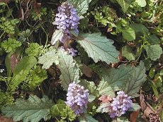 4〜5月に咲く薄紫の集団花 花を重ねたようにつける 花径6mm大 道そばや明るい林内に生える 茎や葉、花には白い毛がある 草丈25cm以下 色は白から薄紫まで 名前は宮中の衣服から 紫色で栽培種のアジュガ(西洋き らん草)がある