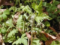 4〜5月に白く細長い花を垂れ下が り咲かせる 線香花火の消えかかった終わりぎ わの様な咲き方だ 山地の樹下に生える 葉が人参に似て細かく割れている 草丈60cm以下