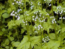 4〜5月に白い5弁の集団花を咲か せる 春のオトコエシか? 花径4mm程度 小葉は3枚から5枚くらいある 日があたる山の湿気のある草地に 生える 葉が芹にも形が似ている 蔓の名前は花が終わるころに地表 につるを伸ばす 草丈40cm以下 同属の鹿の子草は花がピンクで葉 が尖る