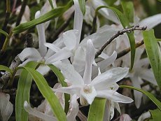5〜6月に白い花を咲かせる(ピン ク色を帯びることもある) 花径5cm程度 山地の岩や樹木に着生する 香り高く高貴 湿度の高い場所を好む 草丈30cm以下 釣鉢にしたり樹木の幹に着生させ て栽培される