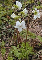 4〜5月に白い花を咲かせる 花径18mm程度 薄い青の縦縞がある 乾いた日当たりの良い草地に生え る 葉は5裂し深く割れる 草丈20cm以下 咲きそろうと清楚で美しい 花が薄ピンクで葉が3裂するえい ざんすみれを見る