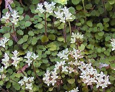 3〜5月咲の多年草 白い花は小さく花径6mm程度 湿気の多い山地に生える 花後は赤く色づく 地面を蔽う感じで拡がる 草丈は15cm程度