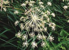 8〜9月咲き 湿気の多い肥沃地に生える 山菜として、若い茎を塩づけして 油いためやテンプラに利用 うどに近い 独特のきわどい味がする 咲いている姿は大型の線香花火の 様 やはり夏の花 草丈3mまでで大型 同属の高地に生える深山ししうど