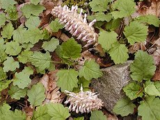 4〜5月咲 山地落葉樹の根に寄生する葉のな い植物 花穂の長さ15cm程度の薄いピンク がかった白い集合花 ブナ科カバノキ科ヤナギ科の木の 根に寄生する 奇妙な花の印象 周りに生えている草は扇葛