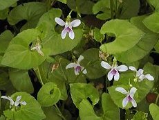 4〜5月咲 湿地や谷川沿いに生える 花色は白で唇弁に紫の筋目がある ツボスミレの一変種で花は同じ 葉が違い両耳が変に長い 草丈30cmまで 花径10mm程度で小さい