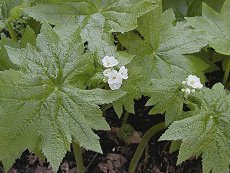 5〜6月咲 深山のブナ林などの落葉樹下に生 える 花径は2cm程度 花色は白で葉の上に花茎を出して 集団で咲く 葉は円形で一つ深い切れ込みがあ り大きい鋸葉 葉は2枚 フキのように地面から長い茎を伸 ばす 円形で黒紫の液果が多数なる 草丈60cmまで
