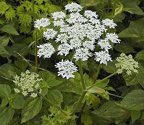 5〜6月咲 花は白色で小集団が集まって傘状 に咲く 花は5弁あり外の花弁が大きい 花径8mm程度 全体の花径は20cmまで 山地の少し湿った道沿いや川岸に 生える 3出羽状複葉で大きくて割れて尖 る 草丈2mまで