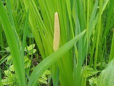 5〜7月咲 丸い棒状の花穂でベージュ色 長さ6cm程度 葉を菖蒲湯に使う 香りが良い 花菖蒲と混同しやすい 池や水辺に生える 草丈90cm以下 雨の季節の植物だ