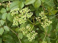 7〜9月咲 小さな4弁の緑の花 中心が赤い 日当たりの良い空き地などに生え る 小葉は5枚ある 藪が枯れるほど強健で、はびこる 5mm程度の円形の黒い実になる こんな花でも蝶が来る 別名 貧乏かずら 近い種類ののぶどう