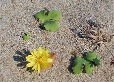 砂浜で4〜10月に咲く 黄色の小花 花径3cm程度 地下茎は砂の中に埋まっているが 花茎を出して花を咲かせる 葉の表面は滑らかで、3枚に割れ たり5枚に割れたりする 割れた葉はイチョウの葉のようで はある 草丈5cm以下 砂から花を直接咲かせていて、そ の風情が面白い 花言葉: