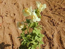 海岸の砂浜で8〜10月に咲く クリーム黄色の花 花径2cm程度 なんとなく金魚草に似ている 蘭の名前は花の形から 草丈40cm以下で地面を這う 宿根草にうんらんもどき(ネメシ ア)がありこれも似ている 花言葉: