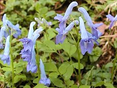 4〜5月咲き 山近辺の腐葉分の多い薄日のあた る斜面に分布 紫ケマンに似た花 花の長さ2cm位 葉の形が違うのと色が紫ケマンよ り青い 葉の形は変異が多い 花色も変異があり赤紫に近い色も ある 草丈30cmまで 全体に咲くと地面が青くなり美し い